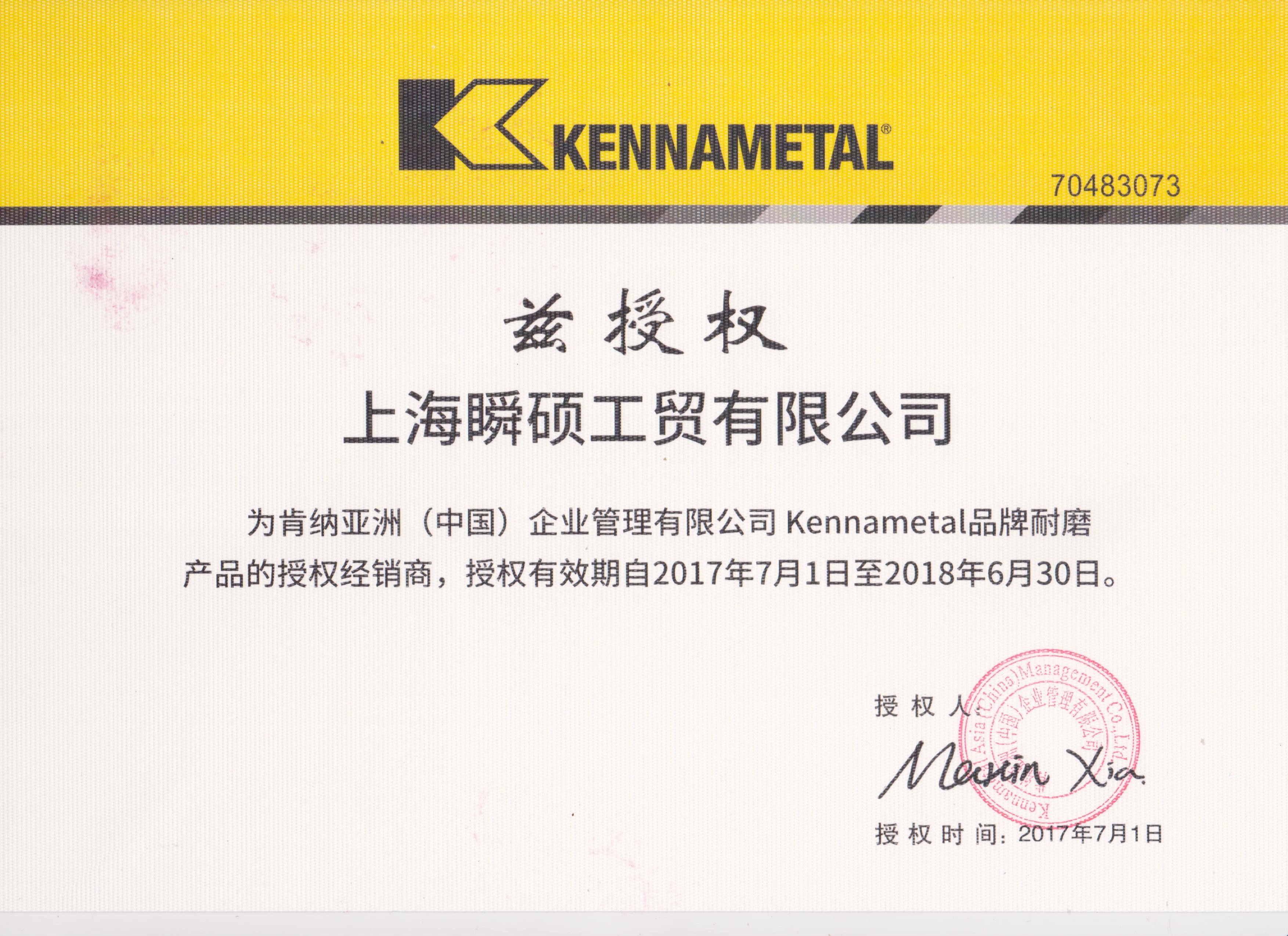 上海瞬碩工貿(mào)有限公司為美國肯納正式授權(quán)經(jīng)銷商(連續(xù)8年)2017-02-23